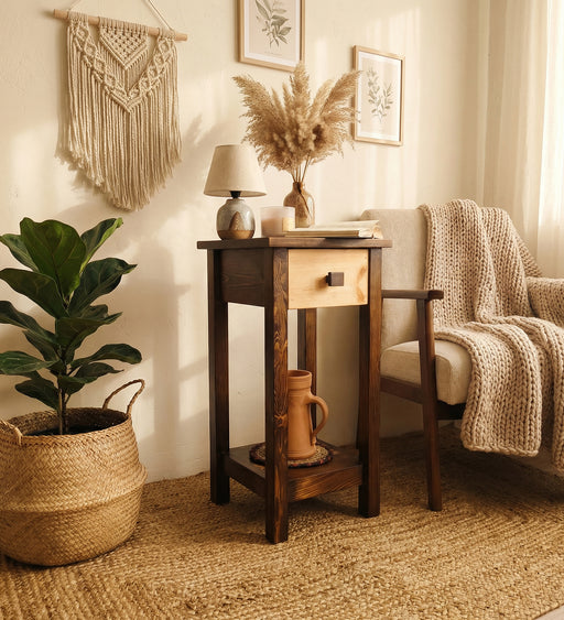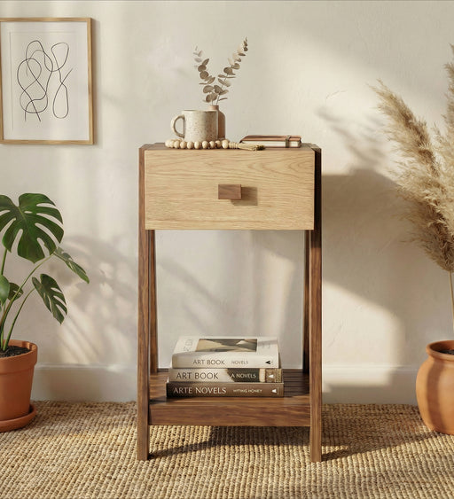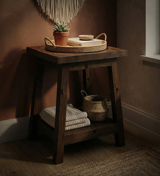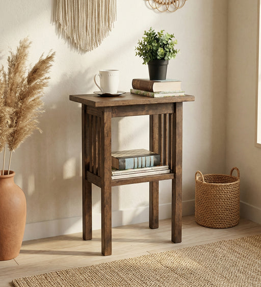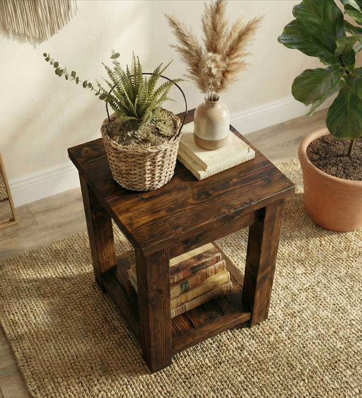 Introduce a touch of elegance to your home with the Amos 2 Tier Solid Wood End Table. Designed with wooden planks on the top and bottom and framed ...
