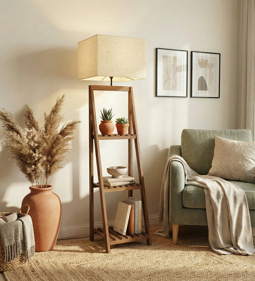 The Francis Wooden Floor Lamp has an unique and functional design. The base of the floor lamp has usable storage spaces to display your planters an...