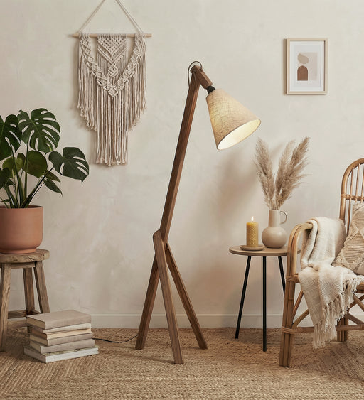 Original price Rs. 5,890.00 - Original price Rs. 5,890.00Original price Rs. 5,890.00Rs. 6,050.00Rs. 6,050.00 - Rs. 6,050.00Current price Rs. 6,050.00Benji Wooden Floor Lamp with Brown Base and Beige Fabric Lampshade